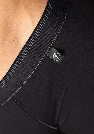 - Kleines Logo-Etikett am Bund oben